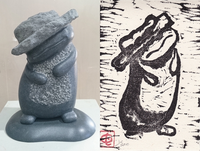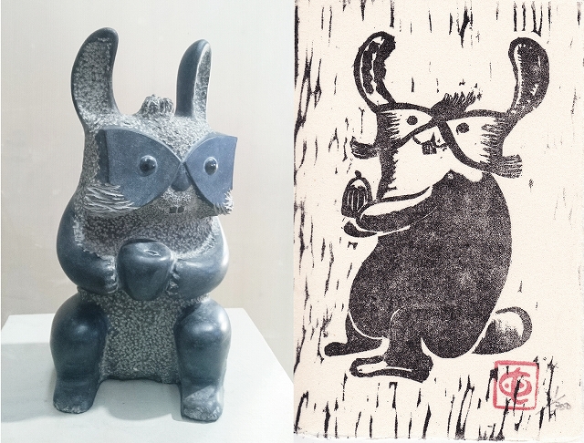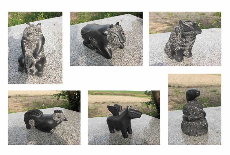 ギャラリーや美術館での展示に加えて、パブリックな空間にも多数(120箇所程)設置され、現代の道祖神のような存在とも言われています。今回の三島市のGALLERYエクリュの森では2005年から7回目の展覧会となりますが、十年程前に作成した木版画を元に二次元のものを石で彫り仕上げた作品が18点初登場いたします。